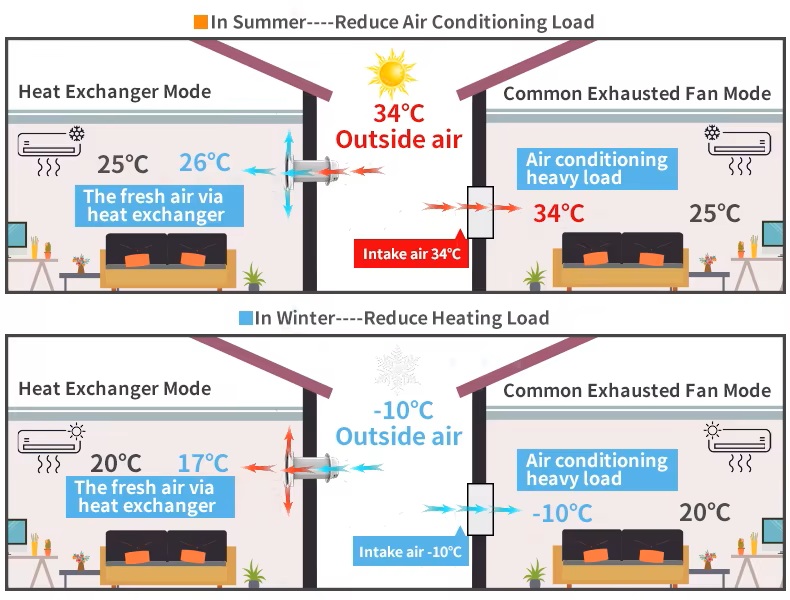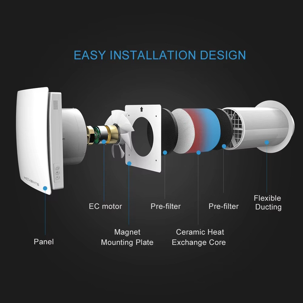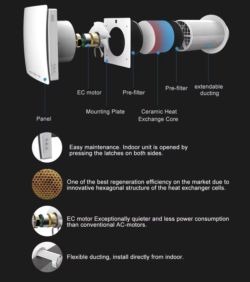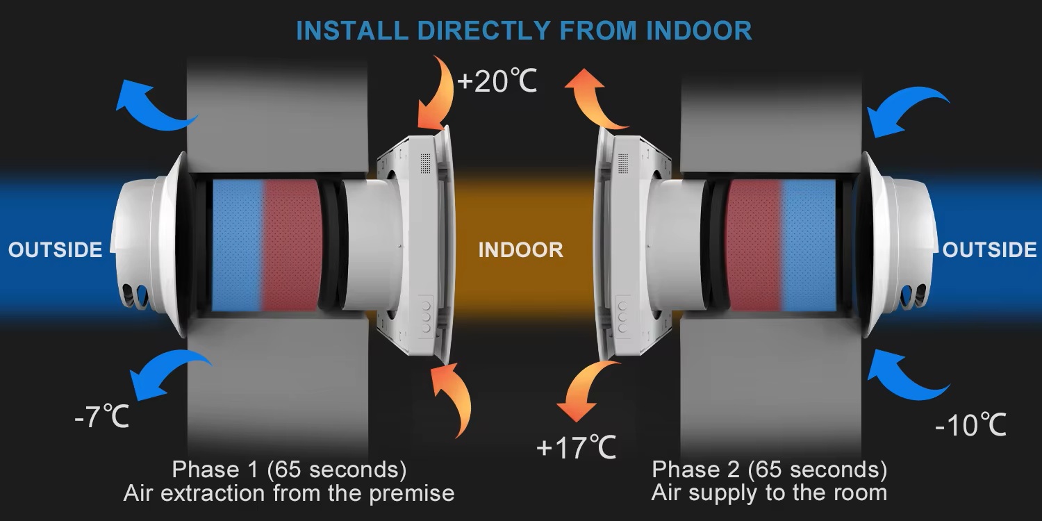 Schimbătorul de căldură ceramic transmite energia termică a aerului extras către aerul proaspăt admis, astfel încât cea mai mare parte a energiei de încălzire a încăperii (90%) este reținută și nu se pierde căldură în timpul ventilației. Acest proces ajută la prevenirea formării mucegaiului și a putregaiului și asigură un climat interior sănătos.
