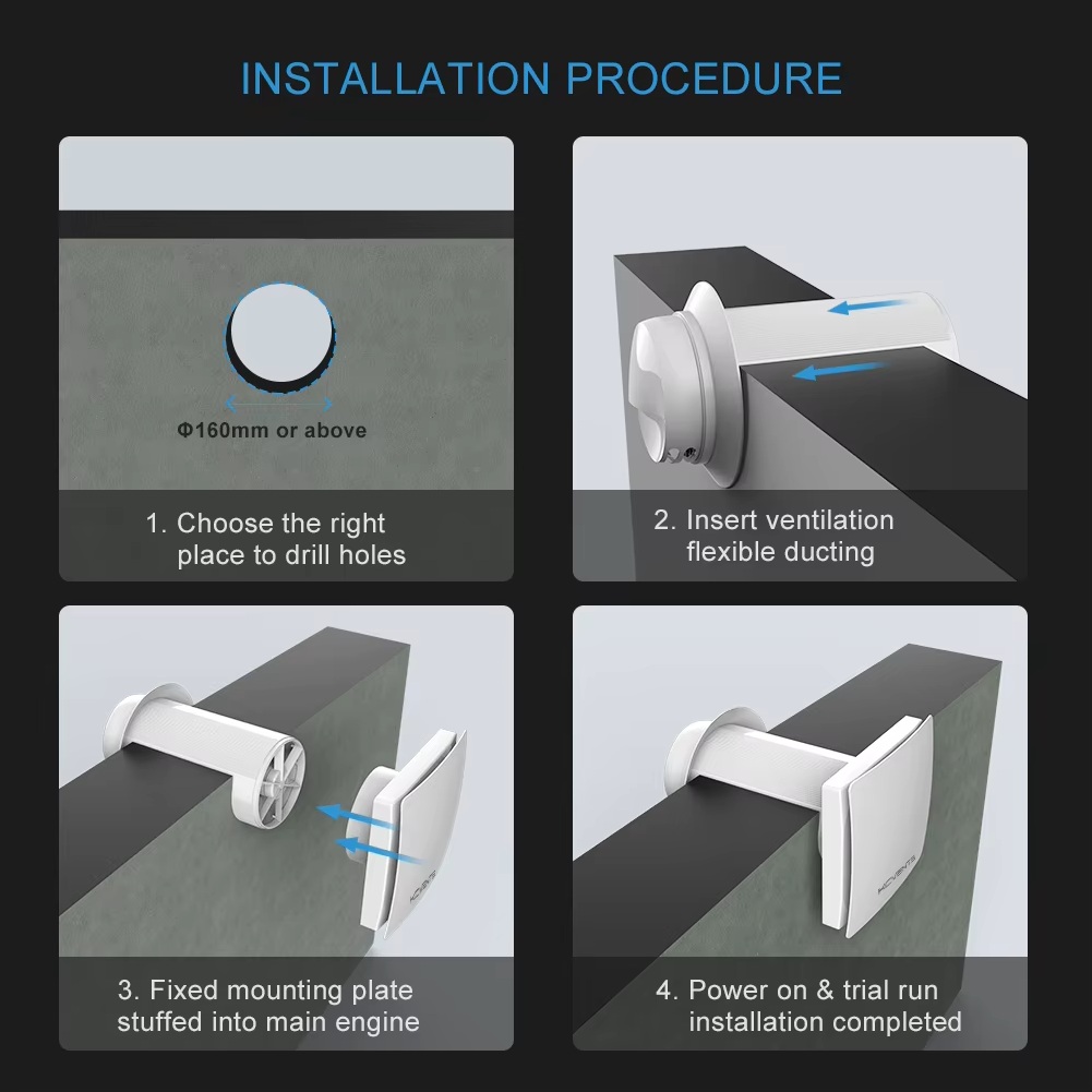 - Funcționare silențioasă: Motorul fără perii, de mare performanță, și designul montat pe perete asigură un nivel de zgomot sub 30 dB, astfel încât nu deranjează liniștea.